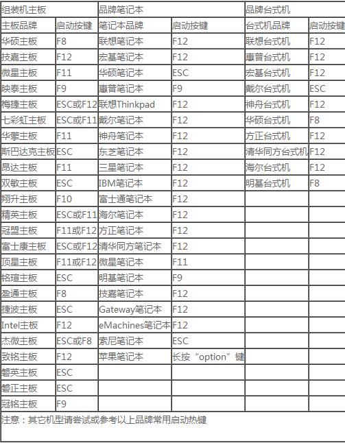下面小编列出各种品牌的一键启动u盘的快捷键查询表: