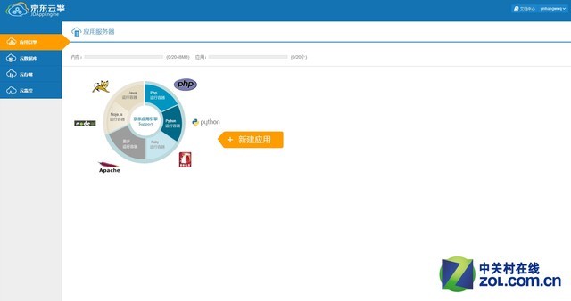 当你拥有京东云擎帐号之后,看到第一张图右上角的控制台按钮了吗?没错,什么也不要想的点进去就是了。京东云擎最大的优点在于简单易懂、童叟无欺,上面这张图是第一次进入京东云擎时的页面,是不是很简单?绝对是学过拼音、学过汉字的小学生都能看懂的吧?