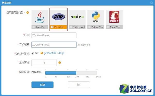 就笔者这几天的试用来看,目前使用JAE搭建网站的人应该不多,很多简短的二级域名都能够注册,笔者为了方便大家理解,所以以“ZolWordPress”为名称和二级域名,大家可以填写的更加简短以便于记忆。二级域名填好之后,你搭载的WordPress网站地址也就产生了,比如笔者的网站地址就是zolwordpress.jd-app.com,此外你还可以根据自身需求,调整下面的内存配额参数,其它都不用动就可以了。