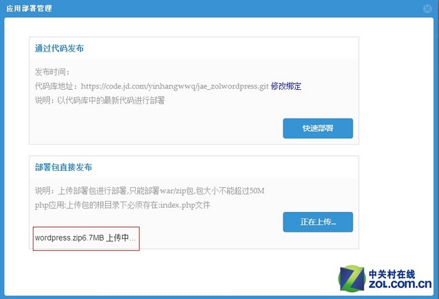 点击上图所示的“上传包部署”按钮,之后找到WordPress安装包所在的位置,直接上传即可。