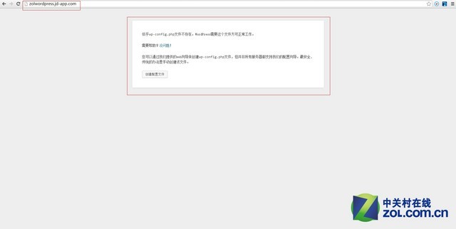 调出数据库服务信息页面之后,在浏览器新建标签页,之后在地址栏里输入刚刚申请的二级域名,比如笔者的二级域名就是zolwordpress.jd-app.com,然后进入该网址之后会弹出下面的页面。看下面对话框中的提示是不是心里咯噔一下,以为失败了呢?没关系,这其实是成功的开始。