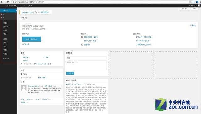 首先进入的是WordPress网站的控制台,不过中文翻译成了仪表盘……这里就不多吐槽了。可以看到左侧一串按钮可以实现WordPress网站的管理和优化,而且你拥有最高的权限,想把这个网站建成什么样子,做什么用,全由你自己说了算,是不是很Cool?