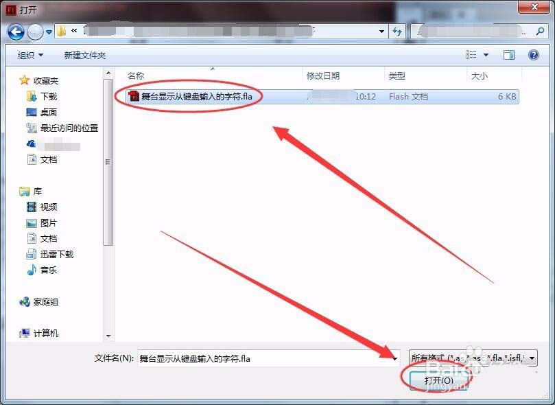 1、打开Flash软件,单击“文件”---->“打开”,打开一个已有的作品“舞台显示从键盘输入的字符(参考作品连接)”。