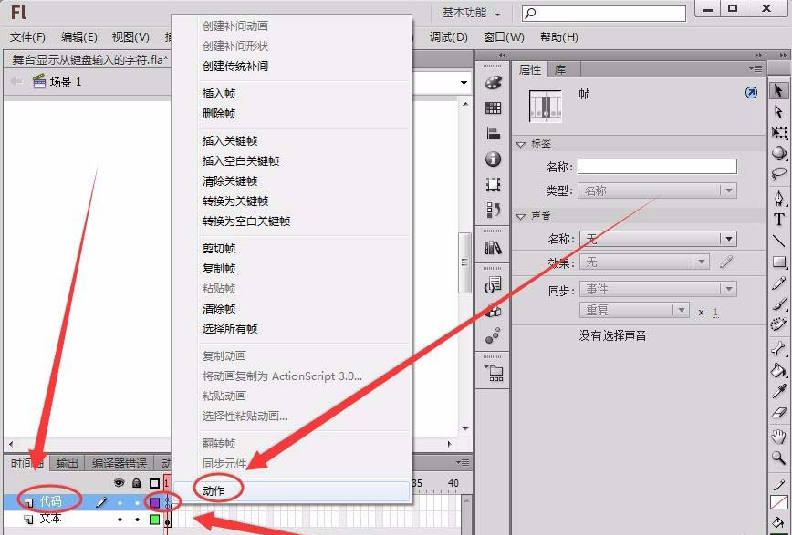 3、在“代码”图层的第1帧右击,选择“动作”选项。