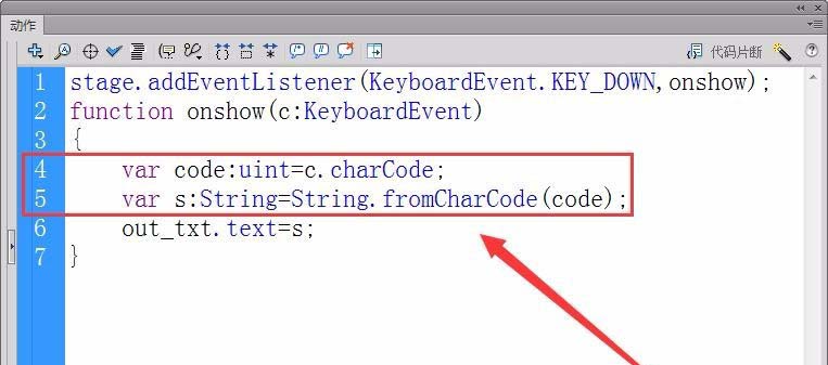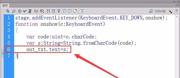 4、在“动作”面板中,已定义了一个键盘事件的帧听器,发送者为舞台stage,接收者函数为onshow。同时定义了侦听器函数onshow,参数c为键盘事件。
