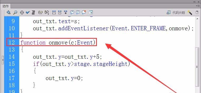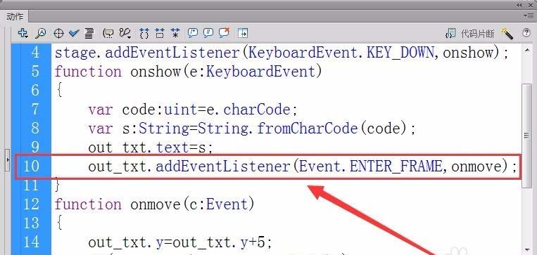 7、接着,定义一个文本对象out_txt的enterframe事件的侦听器,接收者函数为onmove,使字符能不断运动。