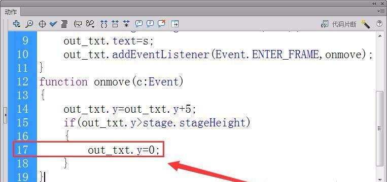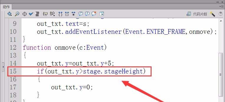10、用if语句判断文本对象Y轴坐标是否已到达舞台底端,判断条件为Y轴坐标是否大于舞台高度。