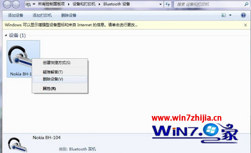 5)在显示Buletooth设备中能看到我们连接的设备Nakia BH―104,然后鼠标右击Nakia BH―104选择“属性”选项;