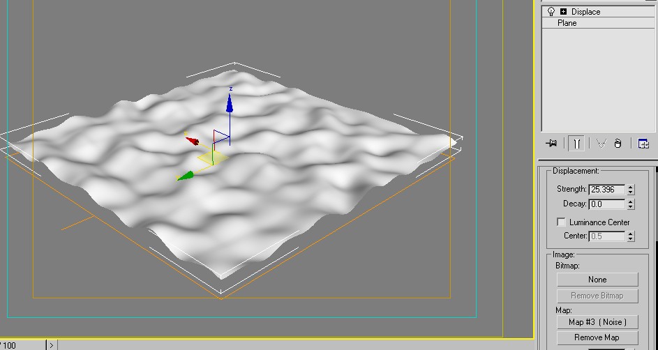 对平面进行变形设置,对其添加一个【Displace】变形修改,设置【Strength】强度值,让对象产生高度上的偏移。如图sf-3所示: