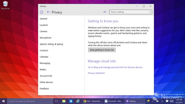 在上周的开发者大会(Build 2015)上,微软正式发布了Windows 10 Build 10074。而在多项新功能中,我们发现该版本已经悄然加入了可清除Cortana已保存的用户信息的选项。为了帮助Cortana理解用户并带来个性化的使用体验,系统会追溯用户的日程安排和文本风格等内容。如果你觉得自己用不到该数字助理,那么可以在这里关闭并清除数据。