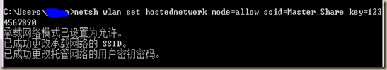netsh wlan set hostednetwork mode=allow ssid=Master_Share key=1234567890