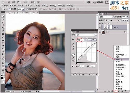 3、新建“组1”图层组,用来管理调色图层。创建一个“曲线”调整图层,然后将RGB曲线向上调节,提高画面的整体亮度。