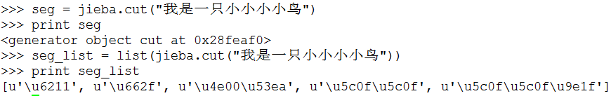 • jieba.cut返回的结构是一个可迭代的generator,可以使用for循环来获得分词后得到的每一个词语(unicode),也可以用list(jieba.cut(...))转化为list
