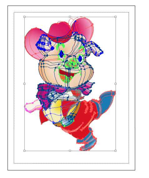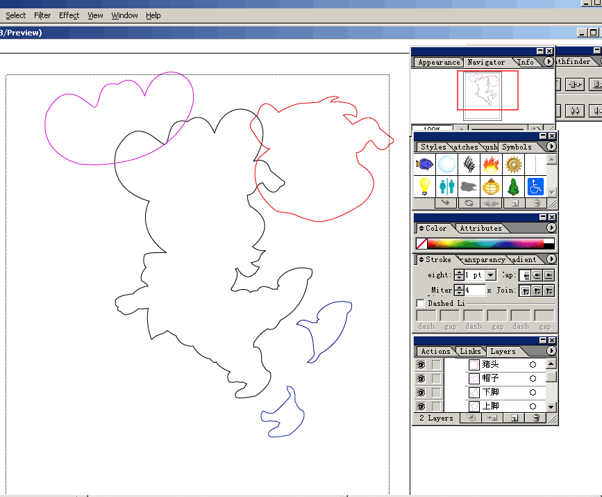 2、然后分别将身体的大部组件分别描绘成闭合区域(因为要填色嘛,当然要描绘成闭合的了),这里注意千万不要盯住一个细节描,不是越细越好哦,有时候反而会影响到整体效果。好,我们现在将猪头:)、猪脚、帽子等描出来了。