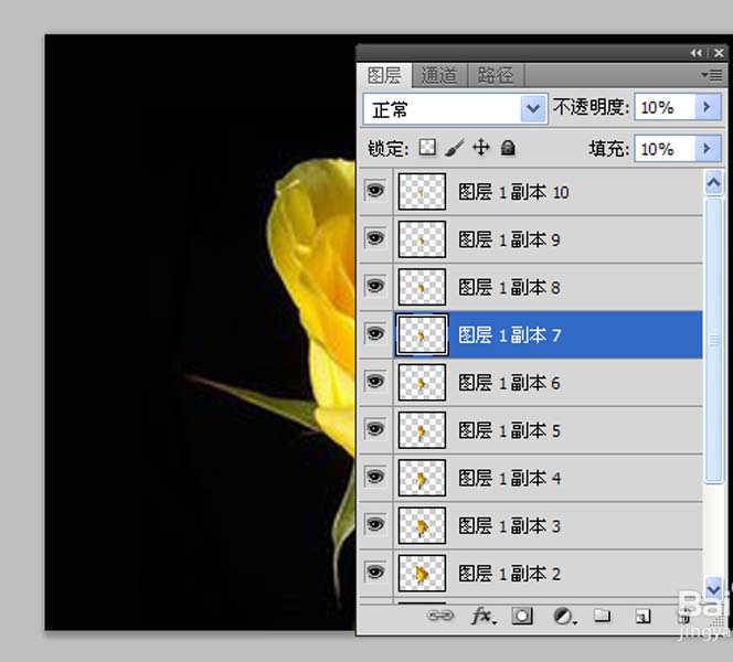 4、修改该图层1的填充和透明度均为10,执行ctrl+shift+alt+t组合键,连续十次,再次建立不同的十个图层。
