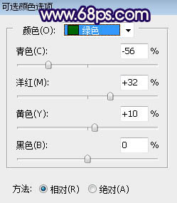 2、创建可选颜色调整图层,对黄色,绿色进行调整,参数设置如图3,4,确定后按Ctrl + Alt + G 创建剪切蒙版,效果如图5。这一步给天空区域增加橙黄色。
