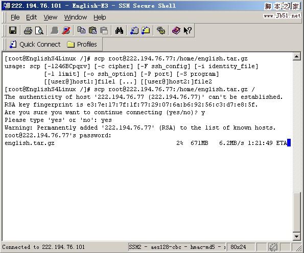 SCP(secure copy)是Linux下一个跨主机拷贝工具,使用方法很简单,而且传输的数据也是经过SSH加密的数据,很安全,而且直连互传速度也相当快,语法也很简洁,如现在SSH上A机,要将B机/etc下面的kaisir.tar.gz文件拷贝到A机的/home下面,则仅仅需要输入: