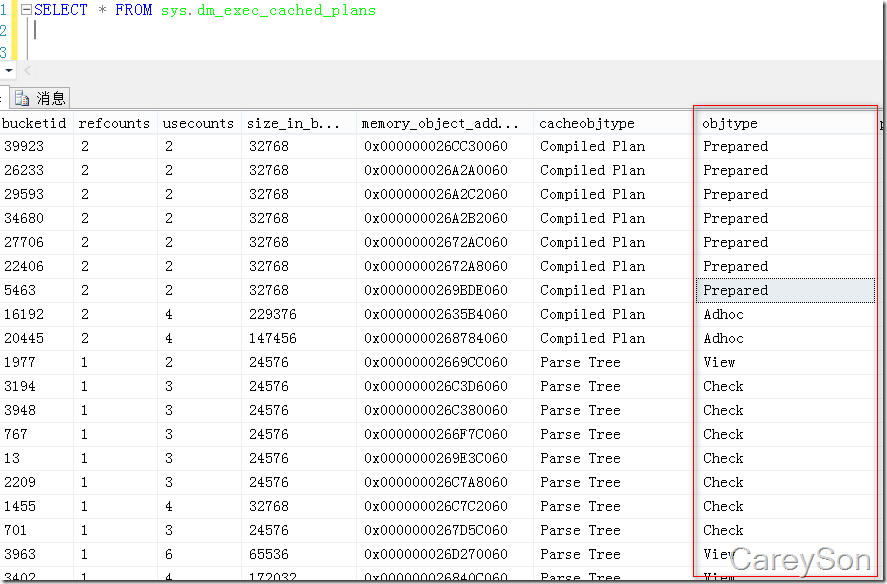 这里重点说一下,缓存的标识符是查询语句本身,因此select * from SchemaName.TableName和Select * from TableName虽然效果一致,但需要缓存两份执行计划,所以一个Best Practice是在引用表名称和以及其他对象的名称时,请带上架构名称。