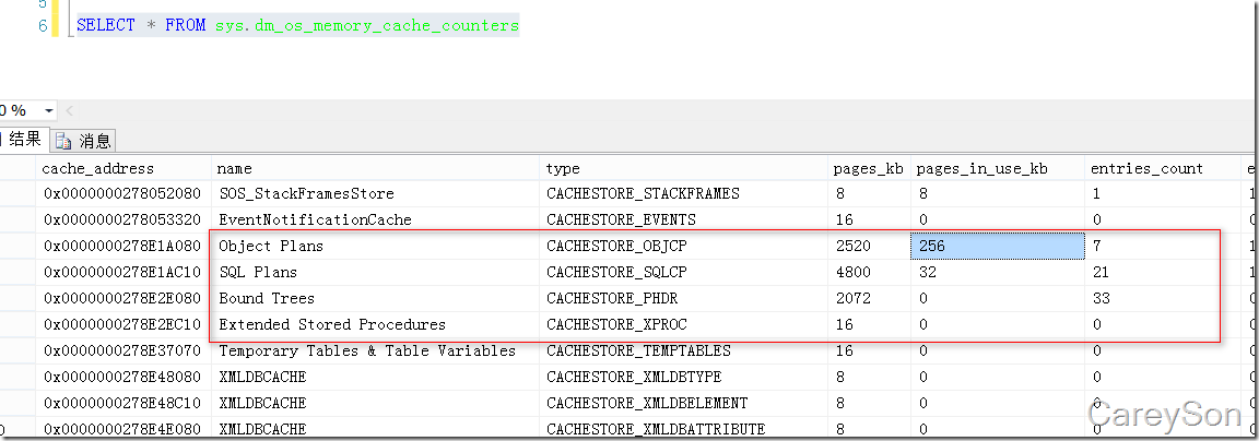 那究竟这几类对象缓存所占用的内存相关信息该怎么看呢?我们可以通过dm_os_memory_cache_counters这个DMV看到,上述几类被缓存的对象如图2所示。