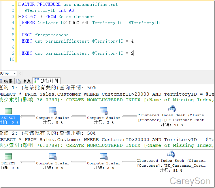 大家可能会觉得,这不是挺好的嘛,根据参数产生不同的执行计划。那让我们再考虑一个问题,如果将上面的查询放到一个存储过程中,参数不能被直接嗅探到,当第一个执行计划被缓存后,第二次执行会复用第一次的执行计划!虽然免去了编译时间,但不好的执行计划所消耗的成本会更高!让我们来看这个例子,如图4所示。