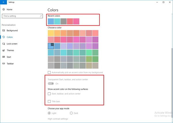 在“设置”>“个性化”中,颜色页面没有带来很多重大更改,但现在Windows 10会保存最近自动使用的最后五种颜色。另外,微软还重新排列了颜色设置,提供一个新的切换开关,可以选择是否让开始,任务栏和操作中心变成透明,以及一个复选框,可在标题栏以及开始菜单,任务栏和操作中心启用或禁用Accent Colors。