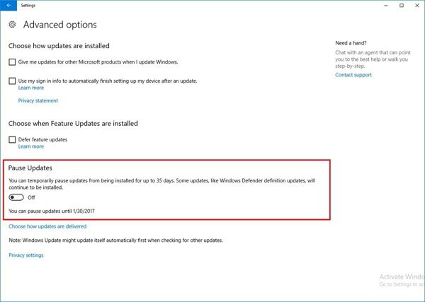 在“设置”>“更新和安全”中,Windows Update页面现在在“高级选项”中增加了新的“暂停更新”功能。根据此功能的说明,用户可以选择在35天内暂停在计算机内安装新的系统更新。不过有些应用不会受到影响,例如Windows Defender。