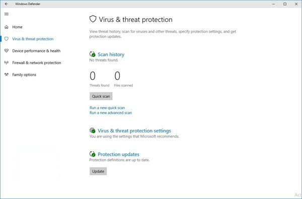 首先在病毒和威胁防护(Virus & threat protection)页面中,可以看到新增了在计算机上运行快速或高级扫描的新选项,可以扫描病毒。在病毒和威胁防护设置( Virus & threat protection settings)中,现在可以更改防病毒设置,并在“保护更新”部分底部有一个更新按钮。