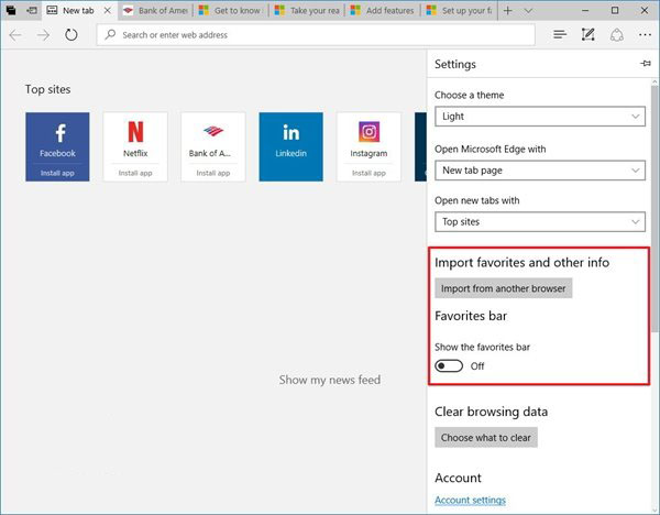 最后,新版本的微软Edge浏览器删除了收藏夹设置页面。现在,用户可以直接启用“收藏夹”栏,或者从主设置页面访问导入收藏夹设置。
