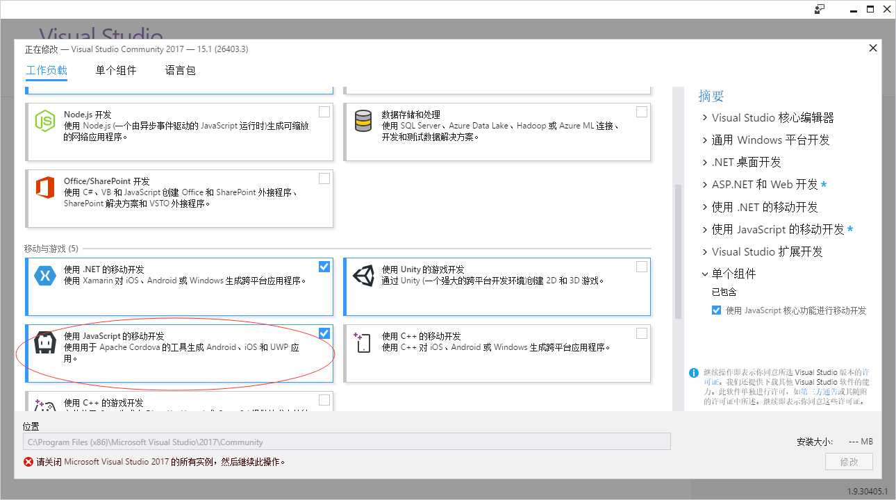 3.2 运行安装程序,需选中使用JavaScript的移动开发,如下图所示。