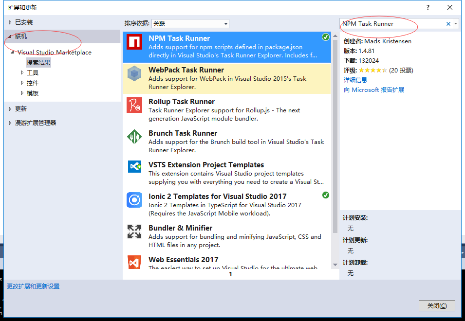 在扩展和更新窗口左侧点 联机 右侧搜索 NPM Task Runner,找到后点下载