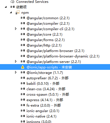 如果顺利执行的话,再次进入VS2017就会发现@ionic/app-scripts已经更新好了。