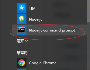 安装完成之后,在windows的开始菜单会有 Node.js command prompt快捷方式。