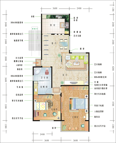 最后点"文件→打印菜单"命令,设置打印幅面(A0-A4或自定义)和打印方向(横向或竖向),至此一幅漂亮的彩色户型图就大功告成(图4)。如果用菜单命令"文件→输出"文件类型为TIF图像文件,可以在Photoshop中润饰,并大幅面写真喷绘,亦可印刷楼盘销售宣传单。