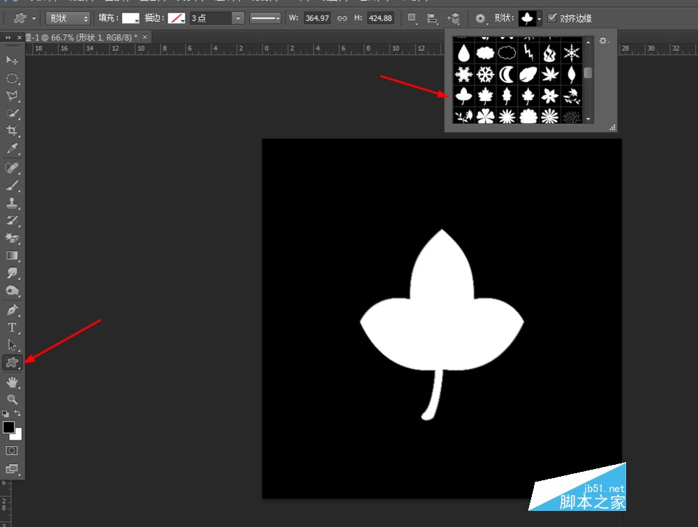 1、在ps软件中,新建一个800*800的文档,背景色填充为黑色,选择自定形状工具,画一个枫叶的形状,如图所示