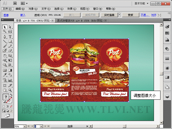 (1)打开本实例配套素材"背景.ai"文件和"西式快餐店POP.ai"。