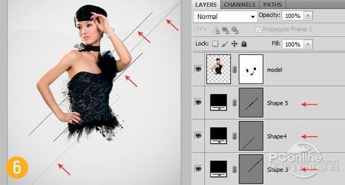 5、在“model”图层下面,创建新的图层,命名为“paint”。用黑色的笔刷在刚才模特被遮蔽掉的位置,绘画如下图图案。这里需要提醒的是,不要重复用一种笔刷,这样图案看起来不会太好。一种笔刷用一次后就改用其他的,这样转换几次,直到尝试出满意的效果。