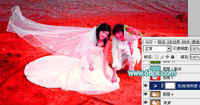 1、打开素材图片,创建色相/饱和度调整图层,选择红色,用吸管吸取沙滩颜色再调整,把背景调红一点,参数及效果如下图。这一步把背景及婚纱的颜色对比拉大,方便后面抠图。