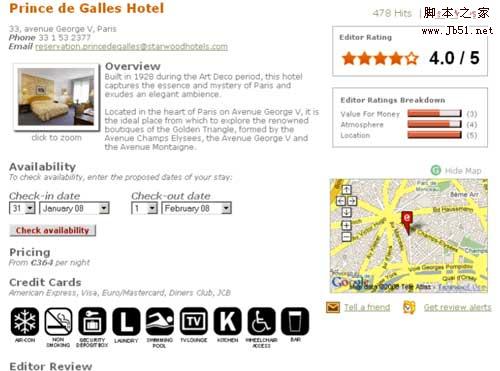 像上面这个酒店预订相关的评论站就添加了编辑评论,编辑总体评分,特色评分以及google map等组成元素,在很大程度上提高了用户体验,非常直观地向客户展示对该酒店最初的认知。