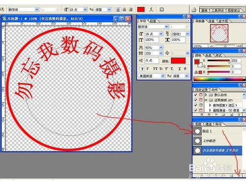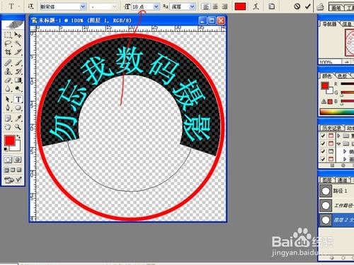 6、在路径1中选定路径,点工具栏中的“文字编辑工具T-横排”将光标放在选定的路径上单击一下,直接输入印章内容的文字,完后按住“ctrl”键,用鼠标调整文字大小 ,之后,点菜单“窗口--勾选字符”调出字符面板并设置好参数,把文字调整好,回到路径面板,删除路径1