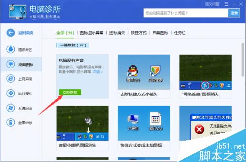 最后、打开桌面图标里面的“电脑没有声音”、然后点击立即修复。