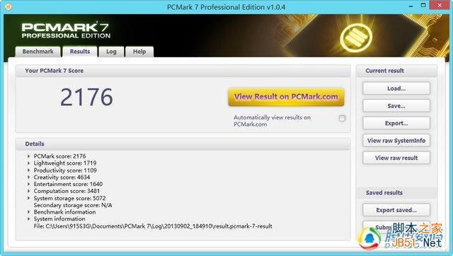 综合性能测试中,我们使用Futuremark推出的专业级系统测试软件PCMark 7。PCMark 7包含七个不同的测试环节,由总共25个独立工作负载组成,涵盖了存储、计算、图像与视频处理、网络浏览、游戏等PC日常应用的方方面面。在PCMark 7的测试表现中得2176分,整体表现略微有点令人失望,PCMark 7是一款对硬盘性能有格外偏重的测试软件,如果搭配SSD的三星ATIV Book 9 Lite尚且无法获得较高的分数,那么问题出在哪里想必就无需我多言了。