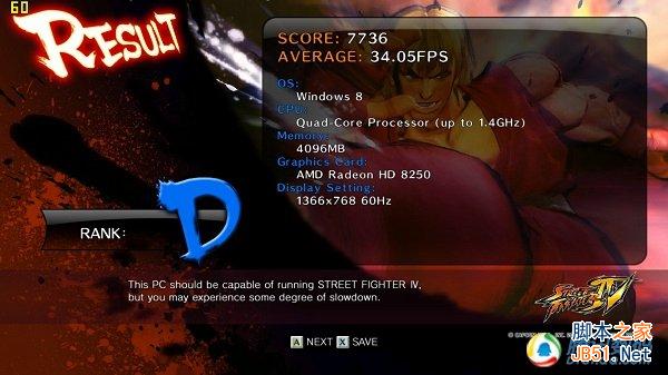 在显示部分的测试中我们选择了《街霸4》这款在目前看来有点低端的游戏,实际测试中搭载的HD 8250核心显卡不能够很好的为游戏带来强劲动力,以至于画面的流畅度大大降低,在1366×768分辨率关闭垂直同步的情况下,仅得到了34帧的平均成绩。我们普遍认为60帧左右才能称之为流畅,显然HD 8250没能很好的完成任务。整体性能与Intel平台的HD 4000核心显卡相差不大,甚至性能上略微有些弱势。所以在这里笔者不建议购买这款产品的朋友用它来玩游戏。