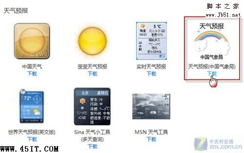 在这里可以看到由小工具爱好者上传的天气预报类的小工具,各种小工具都有其各自的特点,比如显示即时温度、显示未来几天的天气或者显示很详细的综合信息等等。其中更有根据 Windows 自带的“天气”修改的天气小工具。大家可以根据自己的喜好进行选择。