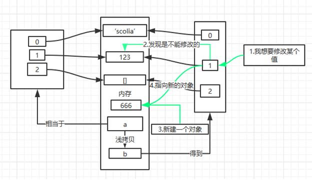 上面讲的这些就是浅拷贝,总结起来,浅拷贝只是拷贝了一系列引用,当我们在拷贝出来的对象对可修改的数据类型进行修改的时候,并没有改变引用,所以会影响原对象。而对不可修改的对象进行修改的是,则是新建了对象,刷新了引用,所以和原对象的引用不同,结果也就不同。