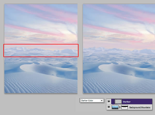 现在,沙子看上去有点像雪了,但是还是有一些问题。首先,前面的一些调整影响了天空;第二,雪的左右两侧似乎不太对称;第三,远处的山脉看不清了。