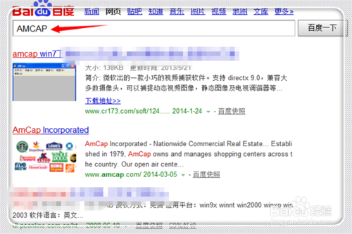 由于不少人直接使用电脑中的设备管理中查看摄像头位置,将其复制出来粘贴到系统的快捷方式文件夹中,不少人反应这是无效的,本人操作确实是无效的,因为很多人没找不到“amcap.exe”。因此按照以下方式简单搞定,在浏览器中输入引号内内容“amcap”,点击搜索,然后下载“amcap win7 v9.11 汉化版”。