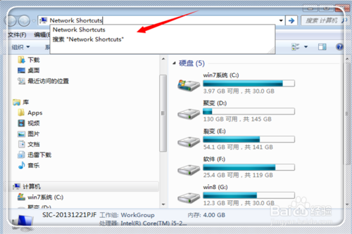 现在复制引号内内容“Network Shortcuts”,然后在桌面点击“计算机”。