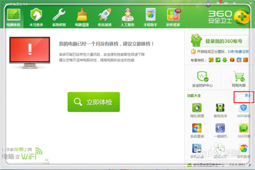 进入到安全卫士主界面,这里点击右方的“更多”,添加摄像头功能。