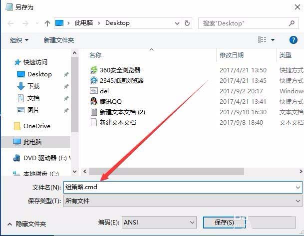 5、然后为保存文件起一个文件名,如组策略.cmd,一定要输入扩展名.cmd,不然无法操作哦。