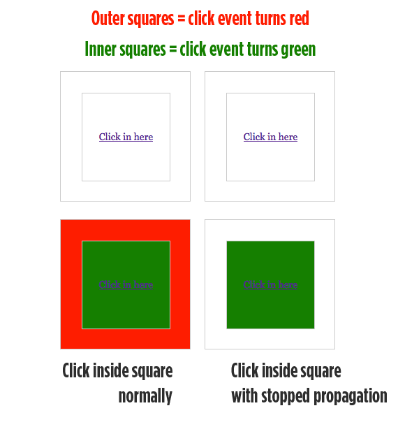 The difference is that return false; takes things a bit further in that it also prevents that event from propagating (or “bubbling up”) the DOM. The you-may-not-know-this bit is that whenever an event happens on an element, that event is triggered on every single parent element as well. So let's say you have a box inside a box. Both boxes have click events on them. Click on the inner box, a click will trigger on the outer box too, unless you prevent propagation. Like this: